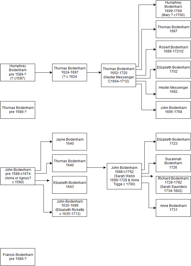 (includes Humphrey Bodenham, Thomas Bodenham, John Bodenham, Francis Bodenham, Thomas Bodenham, Jayne Bodenham, Thomas Bodenham, Elizabeth Bodenham, John Bodenham, Thomas Bodenham, John Bodenham, Humphrey Bodenham, Thomas Bodenham, Robert Bodenham, Elizabeth Bodenham, Hester Bodenham, John Bodenham, Elizabeth Bodenham, Susannah Bodenham, Richard Bodenham and Anne Bodenham